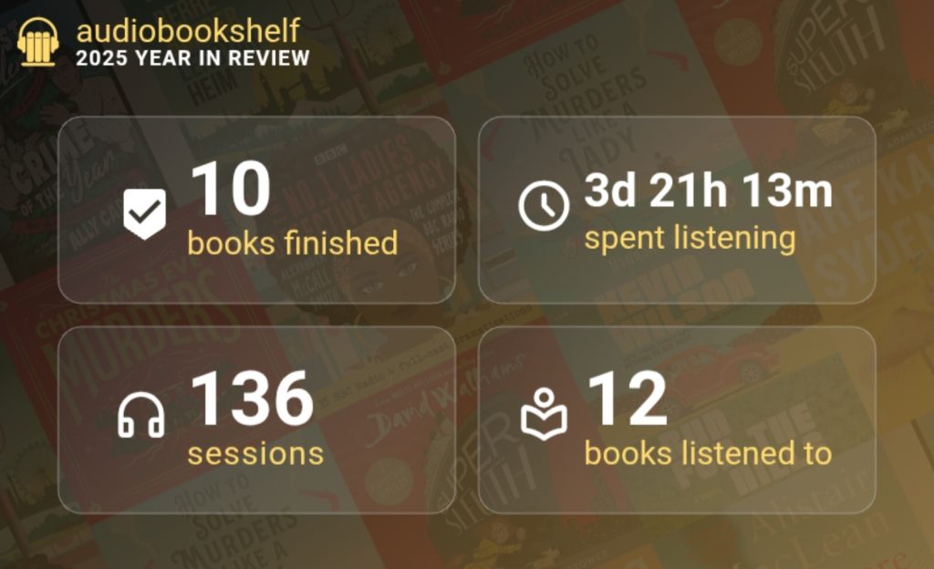 Audiobookshelf was a new one to me, and was easy to install back in August. I host this on a VM at home with a read only mounted network disk from my NAS. Audiobookshelf also offers Podcast handling, but I don’t want to mix those two in the same app, so I have only been using it for audiobooks.I have been using this a lot (on my personal scale). I have nothing negative to say, and have been very happy with it!